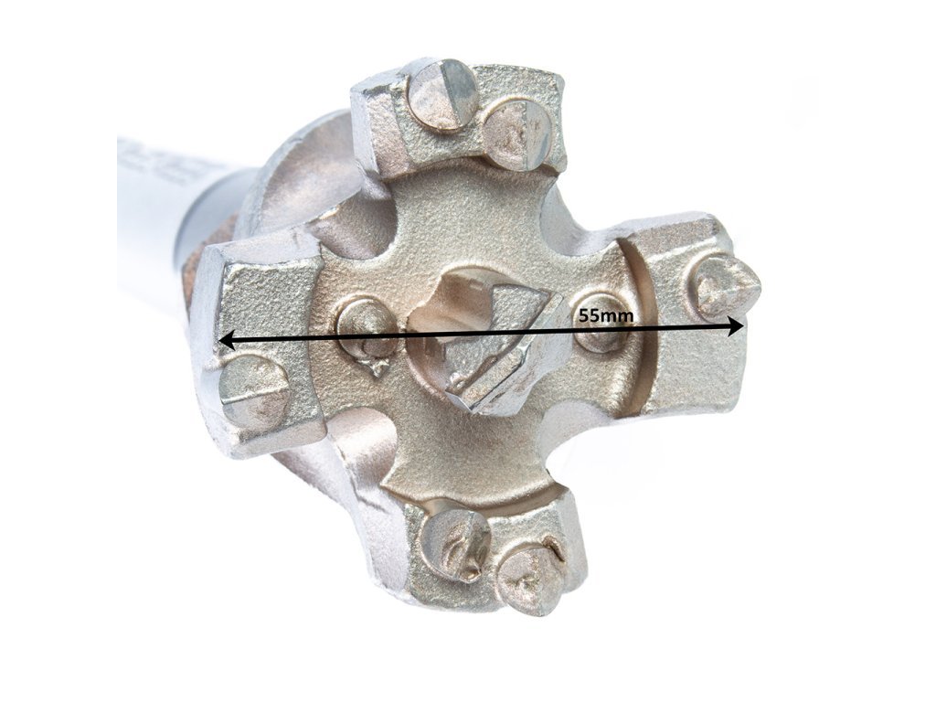 Odolný karbid wolframu s nejjemnějšími zrny Dlouhá životnost a pevnost. Vakuově pájené a kalené pro zvýšenou životnost. Zaručuje rychlé proražení vrtání a dobrý úběr materiálu Pro průrazové vrtání. Vrtací korunky s příklepem SDS-max. Pro průrazové vrtání o průměrech od 45 do 65 mm do betonu, zdiva, silikátových cihel, např. pro spojování vnějších kabelů nebo trubek Jednodílné nástroje se zvonovitou hlavou, asymetricky umístěnými tvrdokovovými kolíky a tvrdokovovým středovým hrotem.