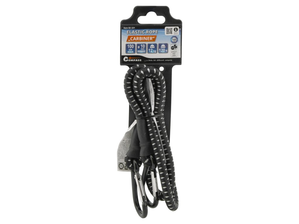 Pružný upínače vysoké kvality, zesílený, homologace TÜV/GS. Zakončeno karabinami pro dokonalé upevnění. Délka 100cm, průměr 10mm.