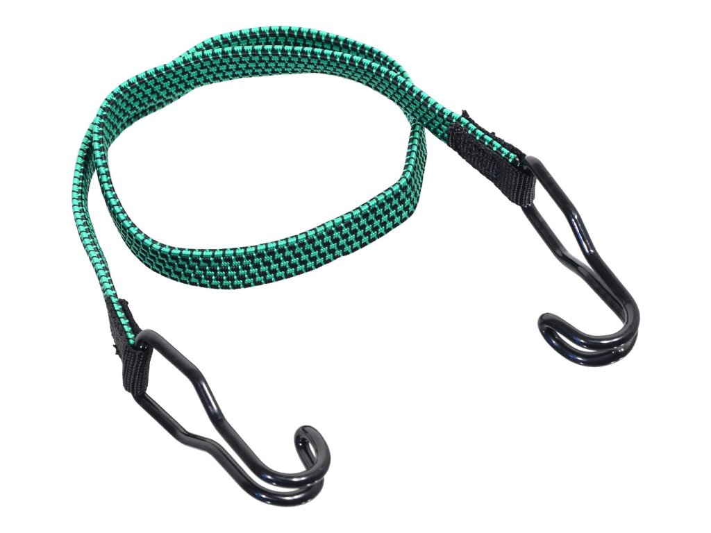 Pružný upínač plochého průřezu zakončený dvěma kovovými háky.