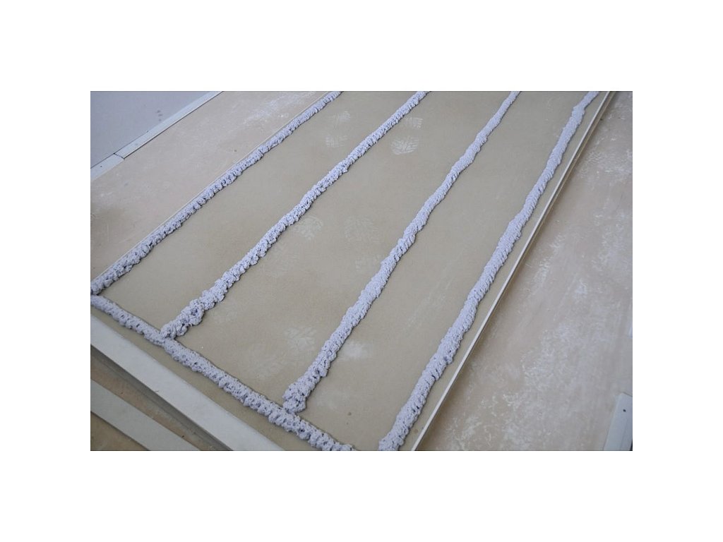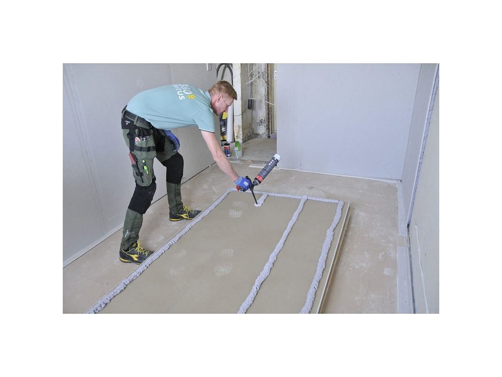 Pěnové lepidlo nanášejte souvisle podél okraje desky (3-4 cm od okraje) a jeden proužek uprostřed, rovnoběžně s delší stranou (mezi proužky lepidla až 25 cm).