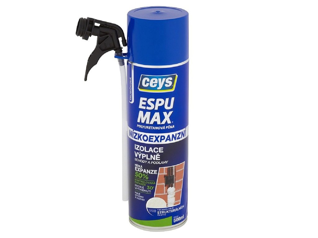 Nízkoexpanzní PU pěna je speciálně určená pro tepelné a zvukové izolace mezi potrubím a rourami, el. zařízení, klimatizací; upevnění všech druhů materiálů, profilů a obkladů, kde je zapotřebí výplně. Poslouží také jako výplň všech druhů dutin, profilů, především ne příliš širokých, roletových schránek a výplň a upevnění dveřních rámů se snížením rizika vydutí. S technologií strukturálních částic – ESPUMAX nízkoexpanzní obsahuje částice s nízkou rozpínavostí, které umožňují kontrolovaný růst pěny.
