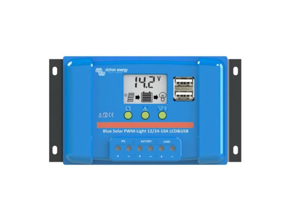 PWM solární regulátor Victron Energy BlueSolar-LCD&USB 20A Svou konstrukcí je určen pro malé ostrovní solární systémy. Pro nabíjení 12V baterie musí mít solární panel 36 článků, nebo pro nabíjení baterie 24V musí mít panel 72 článků a maximálním proud do 20A.Při 12V baterii lze připojit maximálně panel o výkonu do 240Wp paralelní zapojení.