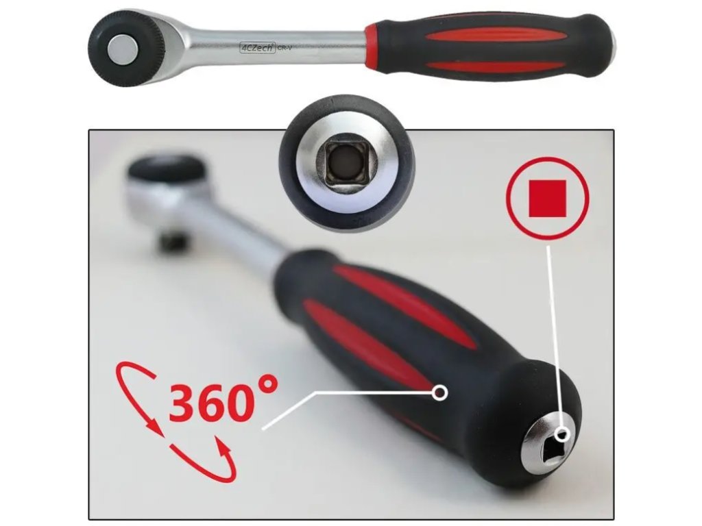 Pro vytvoření větší páky disponuje ráčna vnitřním čtyřhranem na konci rukojeti.