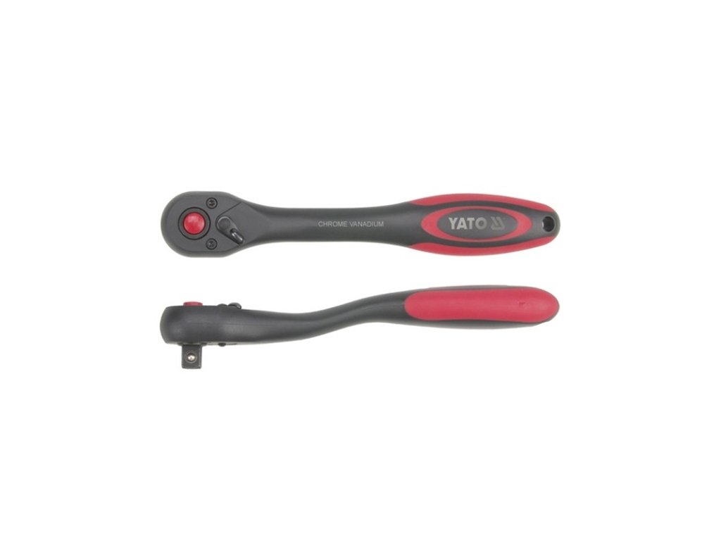Ráčna vyhnutá s plastovou rukojetí 3/8"( 9,5mm) s přepínací páčkou, délka 202mm, ráčnový mechanismus s 72 zubu, vyroben z kvalitní chromvanadiové slitiny oceli CrV6135 splňující normou DIN3122.