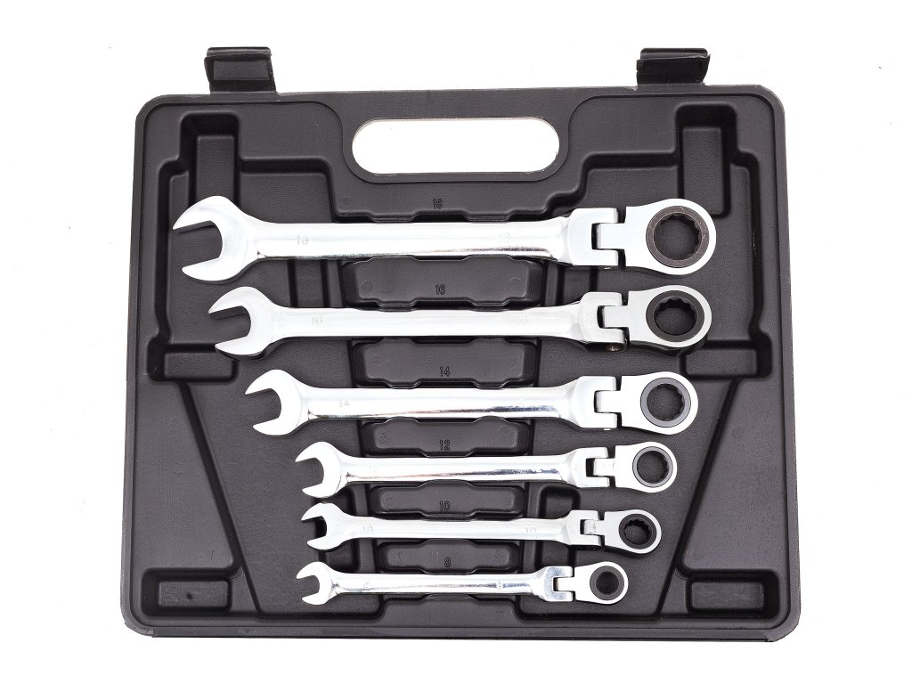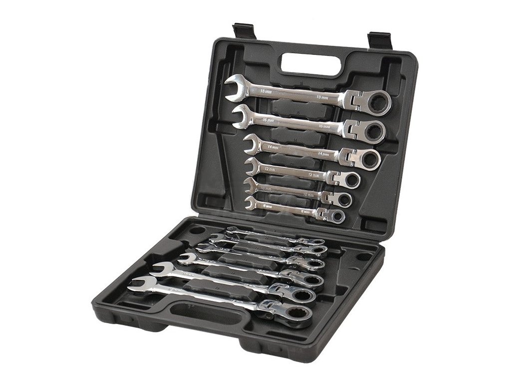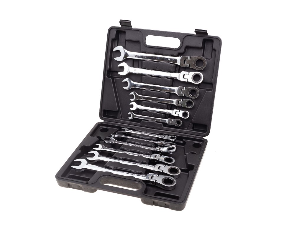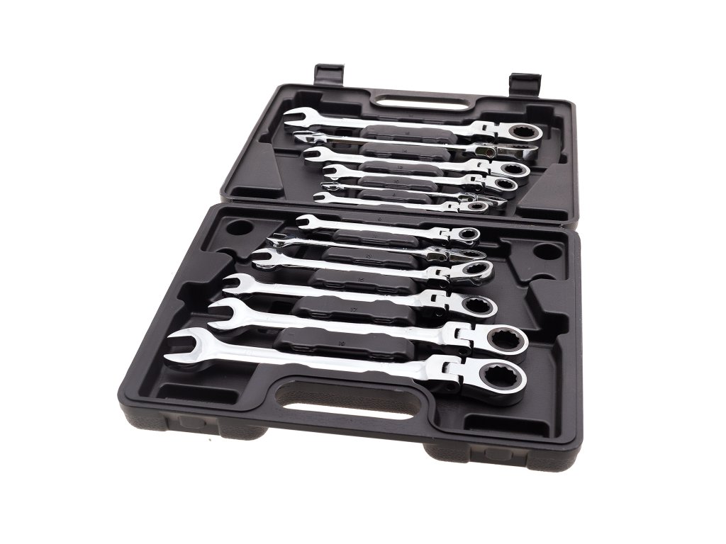 Profesionální 12-dílná sada očkoplochých ráčnových kloubových klíčů – kombinace klasického otevřeného maticového klíče a očkoplochého ráčnového kloubového klíče, kvalitní chrom-vanadiová ocel, provedení – lesk.