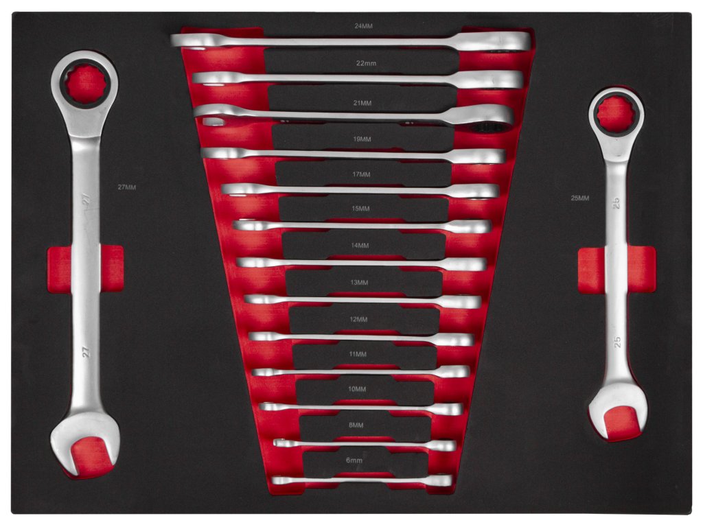Ráčnové očkoploché klíče, 15 ks v pěnové výplni do dílenského vozíku.