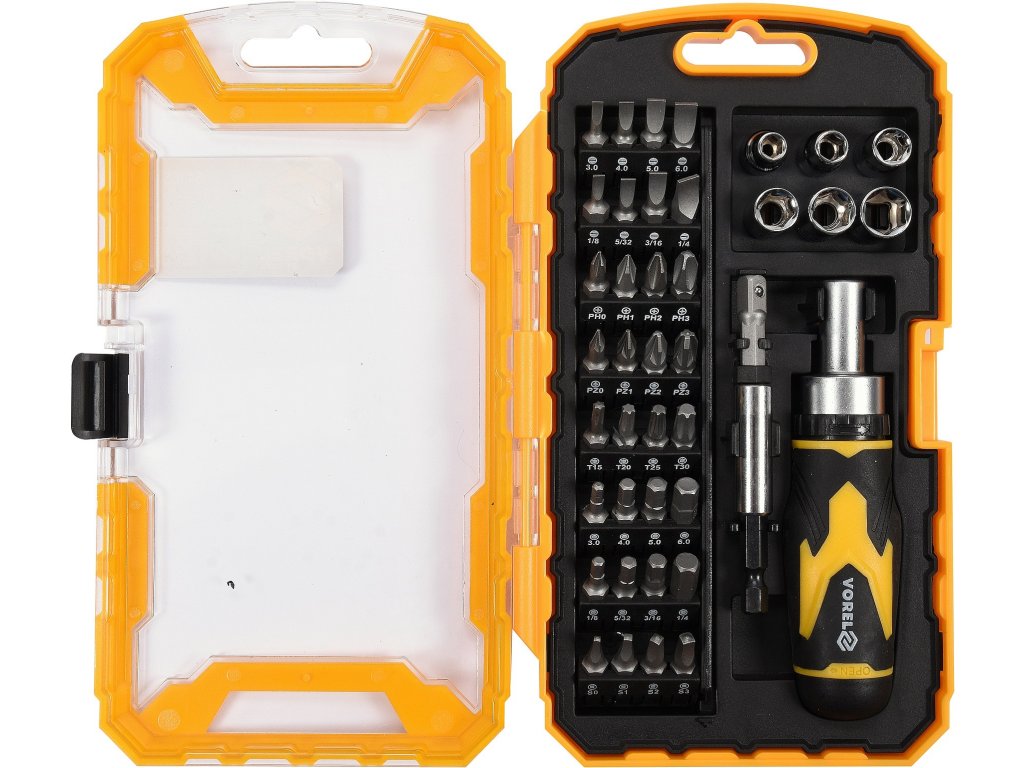 Praktická sada ráčnového šroubováku s bity a nástavci.