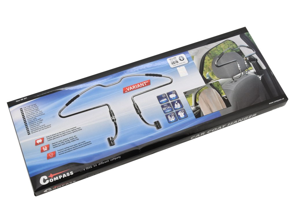 Univerzální ramínko na oděvy k připevnění na zadní stranu opěrky hlavy předního sedadla automobilu.
