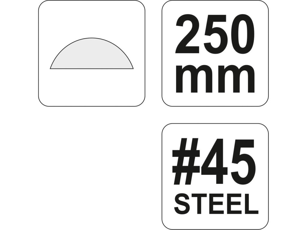 Rašple na dřevo, typ půlkulatá, délka 250mm, sek o hrubosti 45 pro běžné obrábění dřeva, ergonomicky tvarovaná plastová rukojeť se závěsným okem.