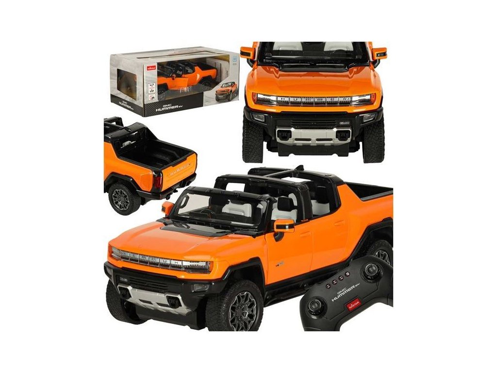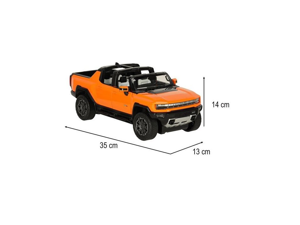 RC auto HUMMER EV 1:16 oranžové Dálkově ovládané auto Rastar 93000 je miniaturní verzí vozu Hummer EV v měřítku 1:16. Model nabízí dva jízdní režimy: pomalý a rychlý, které lze snadno měnit pomocí intuitivního ovladače, jenž poskytuje plnou kontrolu nad vozidlem.RC auto má 6cm gumové pneumatiky , které umožňují jízdu na různých površích. Auto je napájeno 5 AA bateriemi a ovladač vyžaduje 2 AA baterie (nejsou součástí balení). Auto má navíc držák na telefon pro nahrávání videí během jízdy. Hračka podporuje rozvoj jemné motoriky, motorické koordinace a obratnosti.