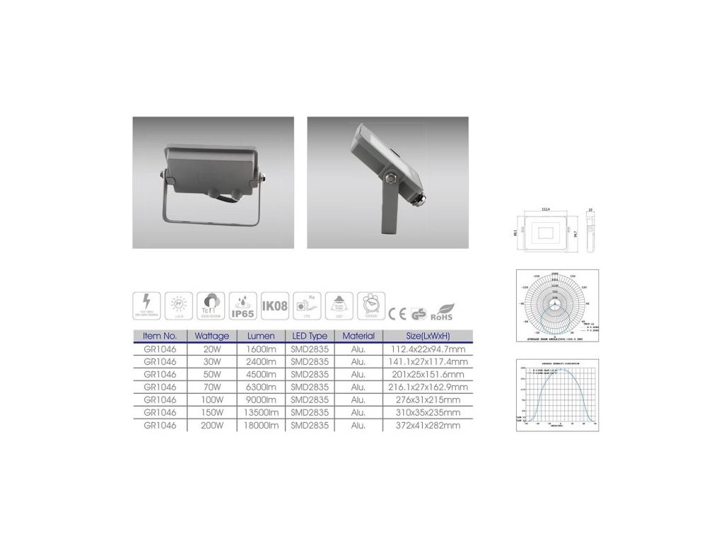 Reflektor LED 150W GR1046 **Specifikace:**Napájení: 85-265VAC