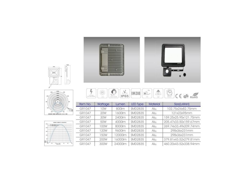 Reflektor LED 20W s PIR čidlem GR1047 **Specifikace:**Napájení: 220-240VAC