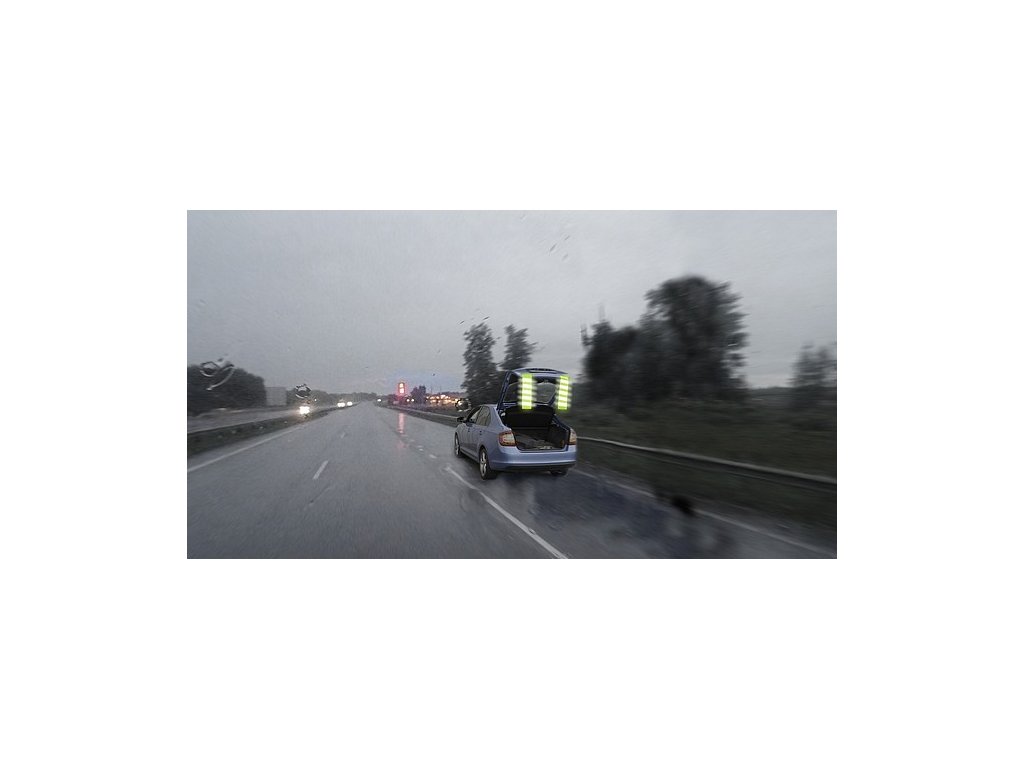 Ideální doplněk k výstražnému trojúhelníku – jen se pomocí magnetů přichytí na auto a to je pak výrazně lépe viditelné.