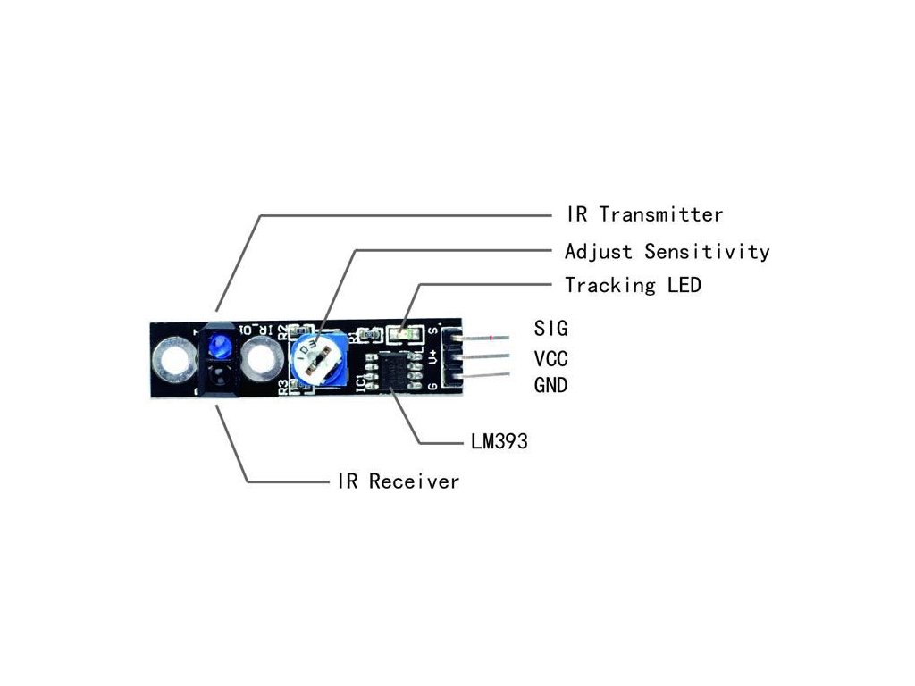 Reflexní světelná závora, modul s LM393 a TCRT5000 /Reflexní optočlen/ Reflexní optočlen pro detekci překážek s lesklou odrazovou plochou. Nastavitelná citlivost pro vzdálenost 0,2-15mm**Specifikace:**