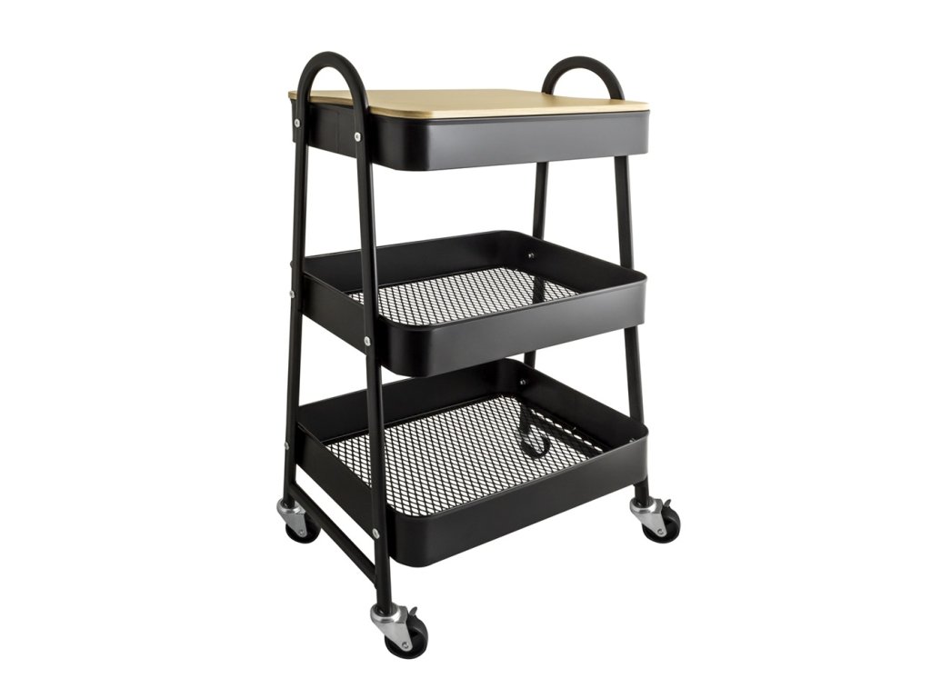 Kvalitní police na kolečkách vyrobená z černě lakované oceli.Horní MDF deska imitující přírodní masivní dřevo, která zároveň slouží jako kryt mělké police na drobnosti.