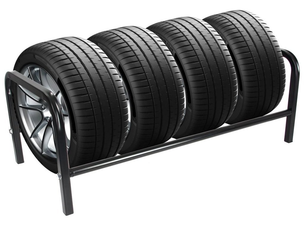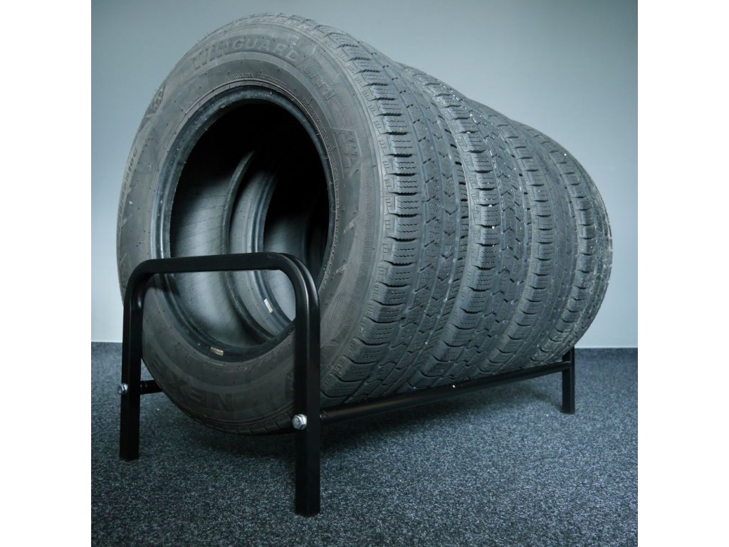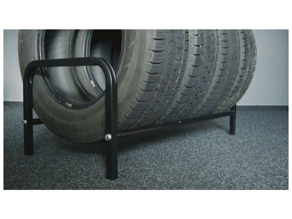 Regál může pojmout až 4ks pneumatik s max. šířkou 215 mm. V případě menšího počtu pneu se zvyšuje úměrně max. šířka pneumatiky. Regál stojí pevně na čtyřbodové základně. Je lehký, praktický a snadno se pohybuje.