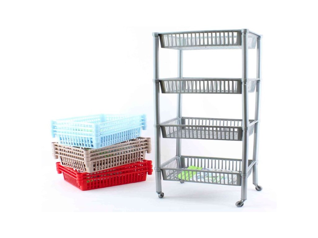 - plastový čtyřpatrový regál na kolečkách vhodný do koupelny, pracovny, dílny, kanceláře apod.- rozměry sestaveného regálu jsou 40 x 30 x 70 cm