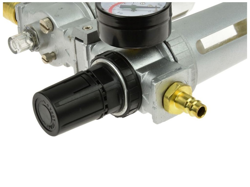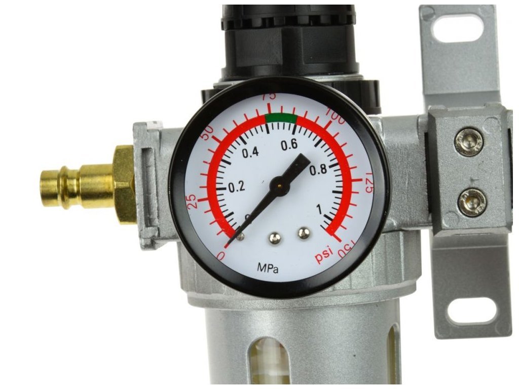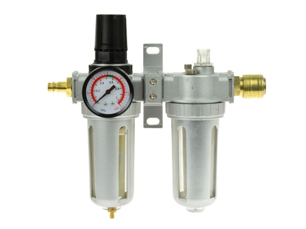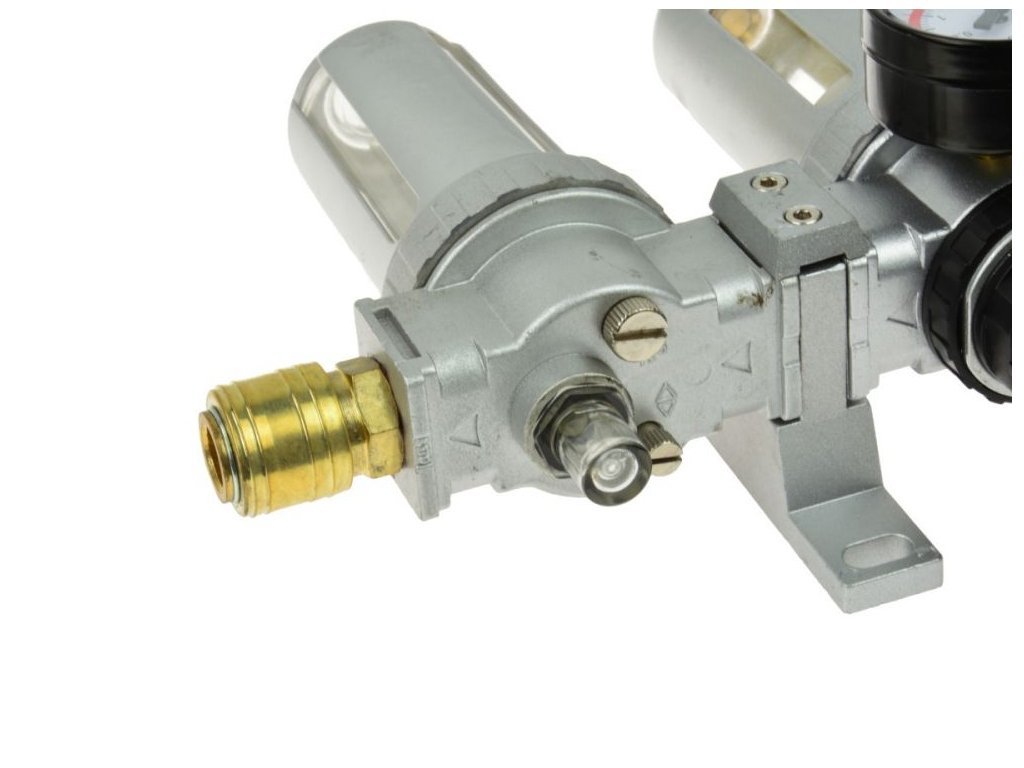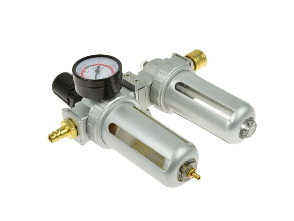 Regulátor tlaku s filtrem a mlhovým přimazávačem oleje je určen k úpravě stlačeného vzduchu pro pohon pneumatického nářadí. Zařízení umožňuje regulovat tlak vzduchu, odstranit zkondenzovanou vlhkost ze vzduchu a přidávat pneumatický olej do proudu stlačeného vzduchu ve formě mlhy.