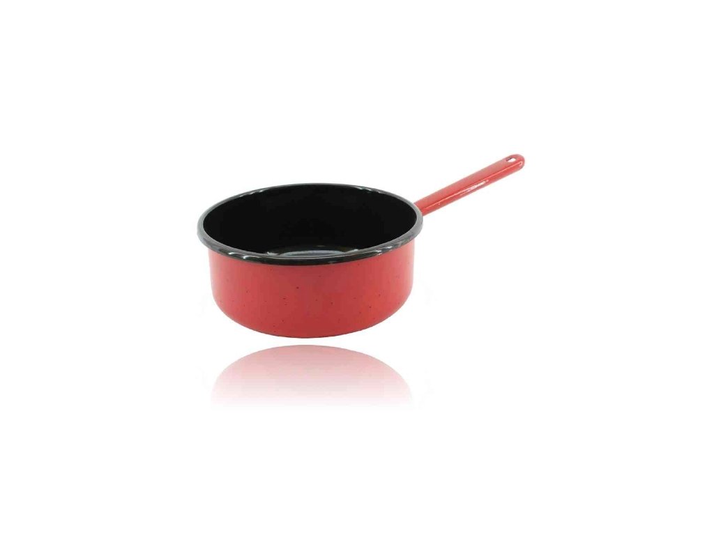 Smaltovaný kastrol s ručkou v červeno černé barvě.Průměr 16 a výška 9.5 cm, objem 1.4 litru.
