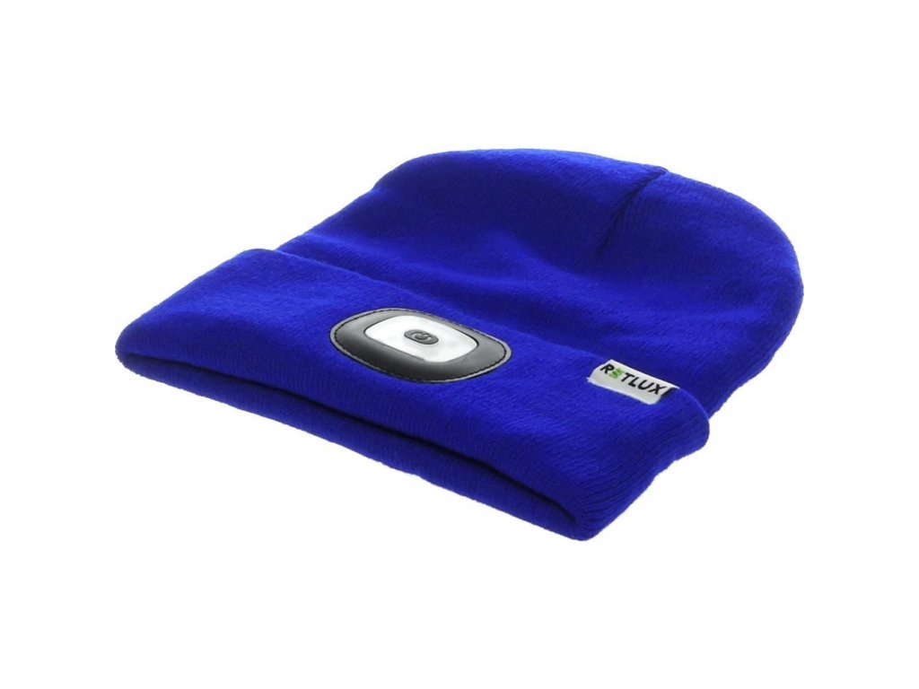 Svíticí nabíjecí čepice modré barvy s LED svítilnou RETLUX. Světlo lze jednoduše vyjmout a čepici vyprat. Zahřeje i posvítí. Stylová čepice RETLUX 2 v 1.