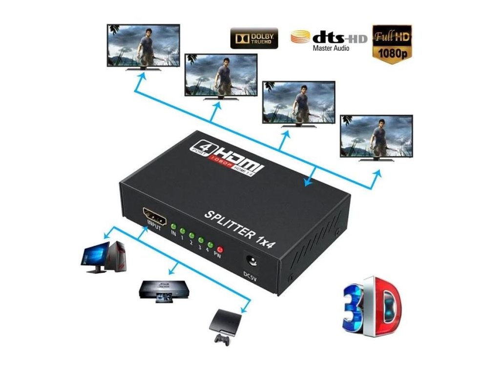 - Přenáší jeden vstupní HDMI signál až do čtyř HDMI zařízení najednou