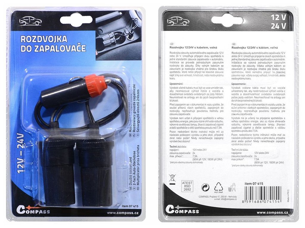 Rozdvojka zásuvky automobilového zapalovače 12 V nebo 24 V. Umožňuje připojení dvou spotřebičů k jedné standardní zásuvce zapalovače v automobilu.