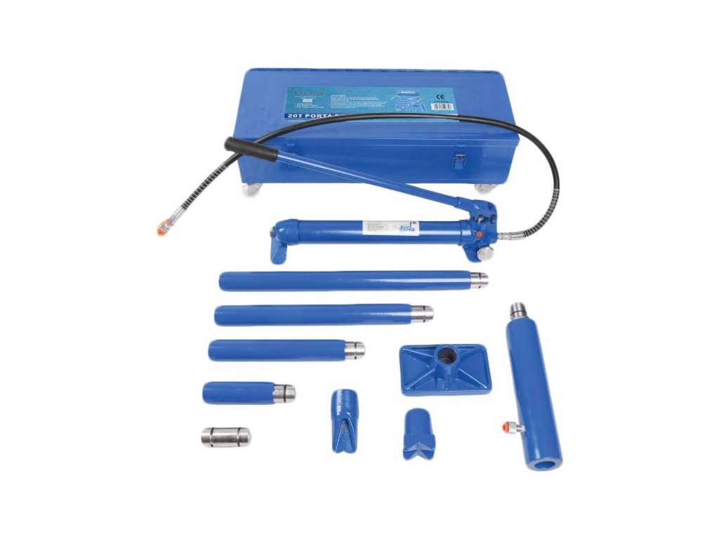 Souprava hydraulické pumpy, rozpěrného válce, prodloužení a nástavců určená pro zvedání, stahování, ohýbání, rovnání, roztahování a podobné práce na karoseriích osobních, dodávkových a nákladních vozidel.