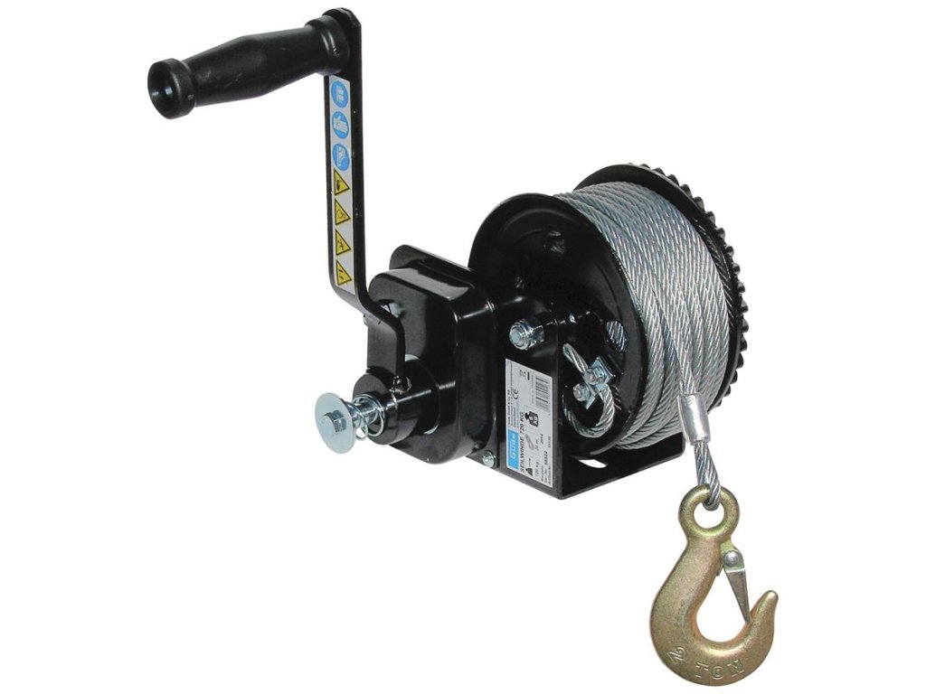 Ruční lanový naviják s integrovanou brzdou, určený k přitahování břemen (→ maximální zatížení v tahu: 720 kg).