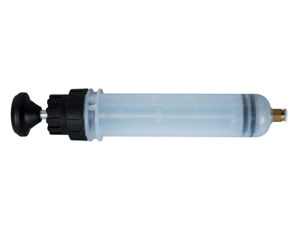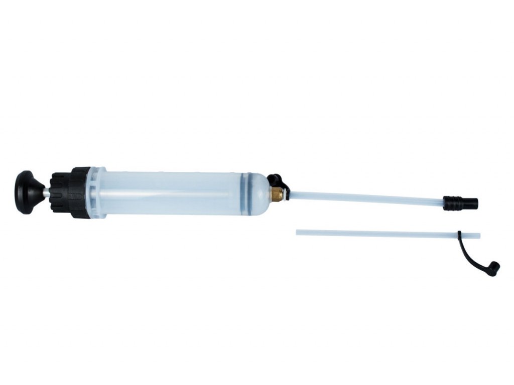 Ruční pumpa typu injekční stříkačky sloužící k odsávání oleje. Odsávačku si můžete prodloužit.
