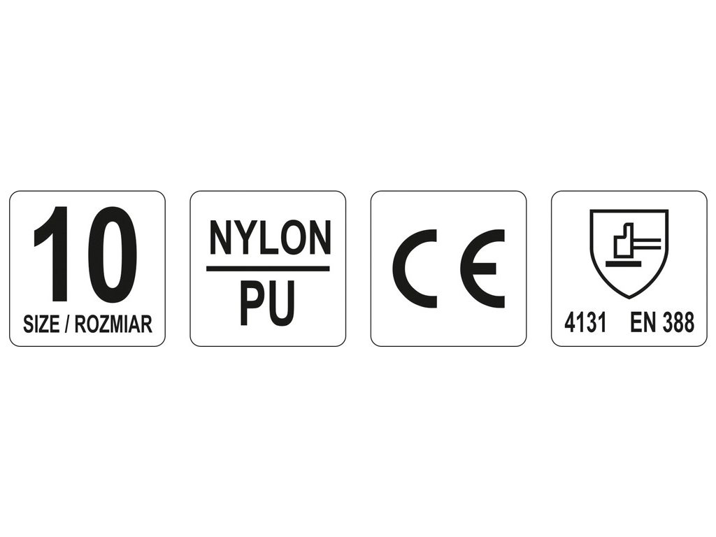 Rukavice splňují požadavky normy EN388 (chránící proti mechanickým rizikům) s úrovní výkonnosti 4; 1; 3; 1.