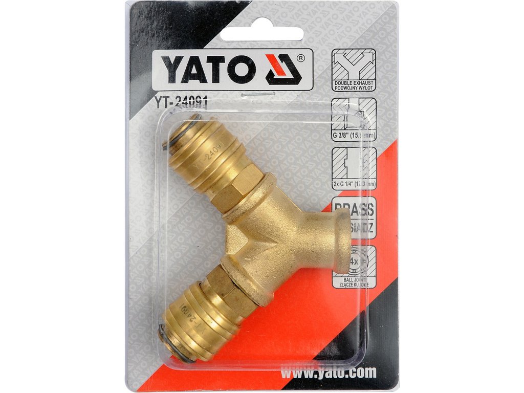 Rychlospojka pro stlačený vzduch s vnitřním závitem G 3/8" a dvěma vnějšími závity 1/4"F a 1/4"M.