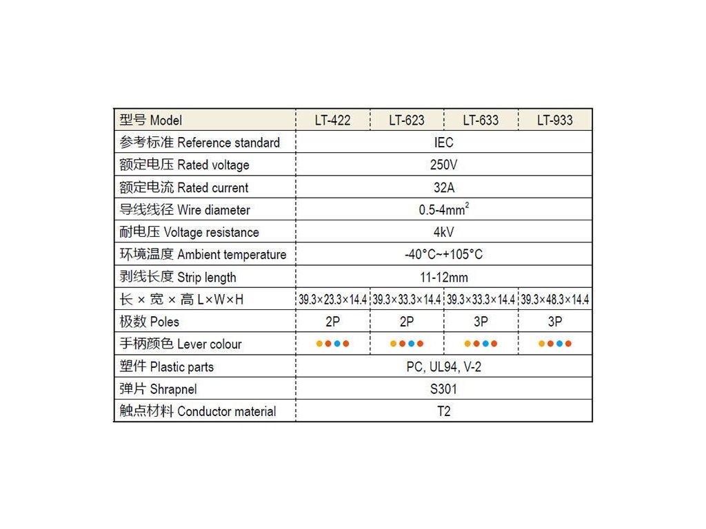 Rychlospojka bezšroubová LT-422 pro kabely 0,5-4mm2 Proud až 32A, Umax=250VACDoplňkové parametry
