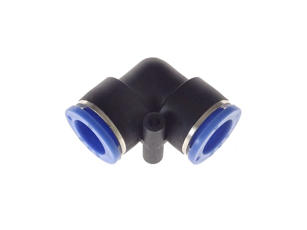 Hadicová rychlospojka nástrčná úhlová (kolínko, L-spojka), průměr 12 mm, úhel zahnutí 90 stupňů.Určena pro spojování pneumatických hadic a hadiček se stlačeným vzduchem.Vhodné např. pro tlakovzdušné vedení nákladních vozidel, max. tlak 10 bar.Po zastrčení hadice dovnitř ji čelistí zachytí a zabrání jejímu nechtěnému vysunutí. Povolit je lze pomocí zasunutí pojistky (modrý kroužek) dovnitř.Doplňkové parametry