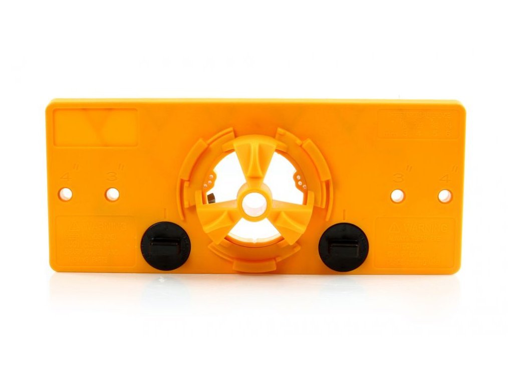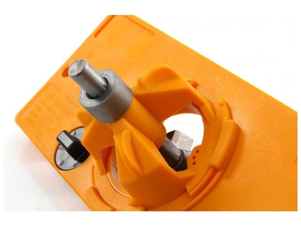 Šablona pro vrtání otvorů pro panty do nábytkových dvířek pomocí vrtačky/šroubováku.