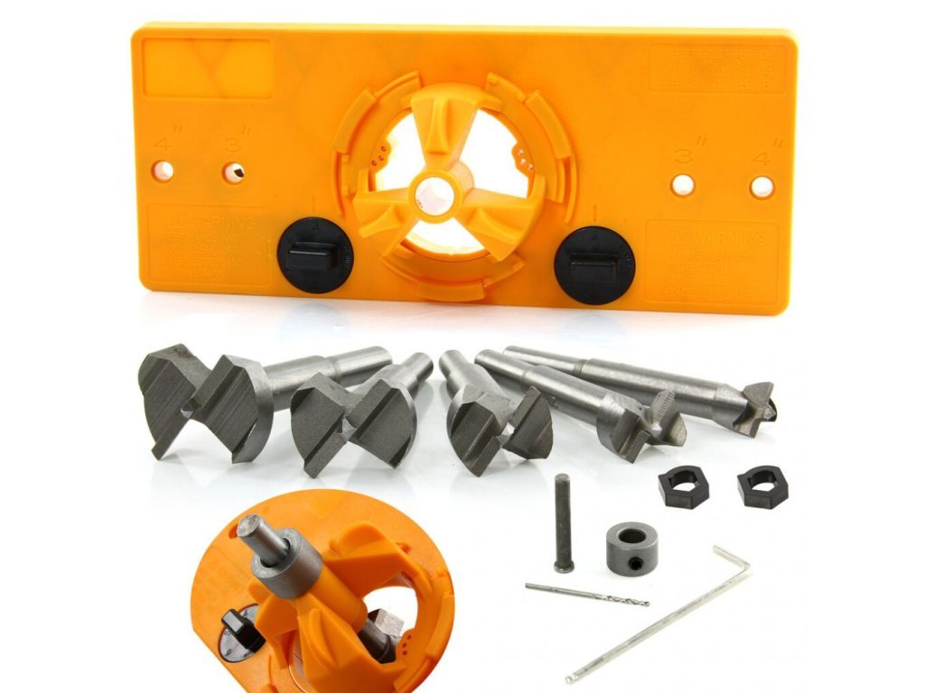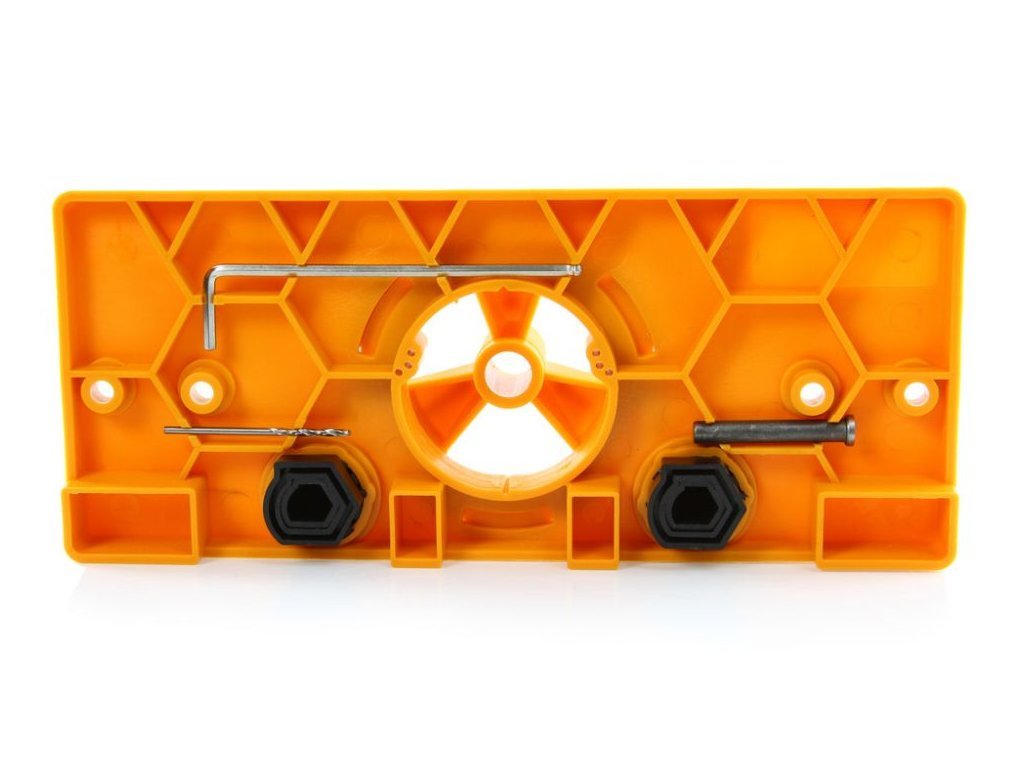 V balení je vše, co je potřeba pro správné vyhloubení otvorů, šablonu, záhlubníky 15, 20, 25, 30 a 35 mm), doraz a imbusový klíč.