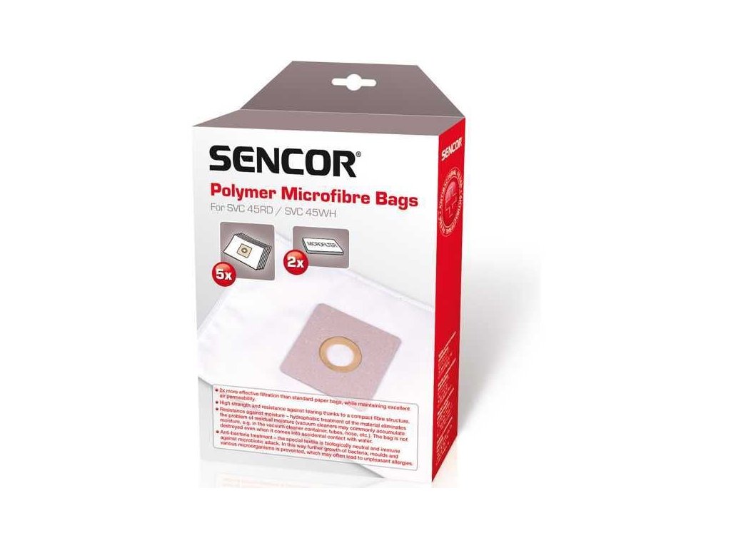Sáčky do vysavače SVC 45/52 (5ks) SENCOR Mikrovlákenné sáčky, Sáček pro jednorázové použití, Obsah balení: 5 sáčků + 2 mikrofiltry, 2x účinnější filtrace, než klasické papírové sáčky, Účinnost filtrace na úrovni HEPA filtruVysoká pevnost a odolnost proti protržení díky kompaktní struktuře vlákenDoplňkové parametry