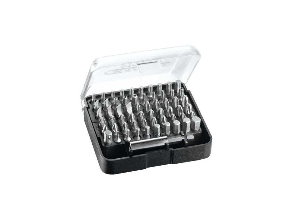 Praktická sada nejpoužívanějších bitů ve velikosti 1/4" v plastovém boxíku. Krom bitů sada obsahuje také magnetický adaptér a adaptér na bity s aretací – zámkem.