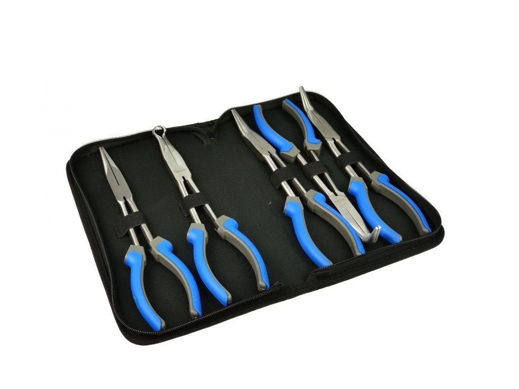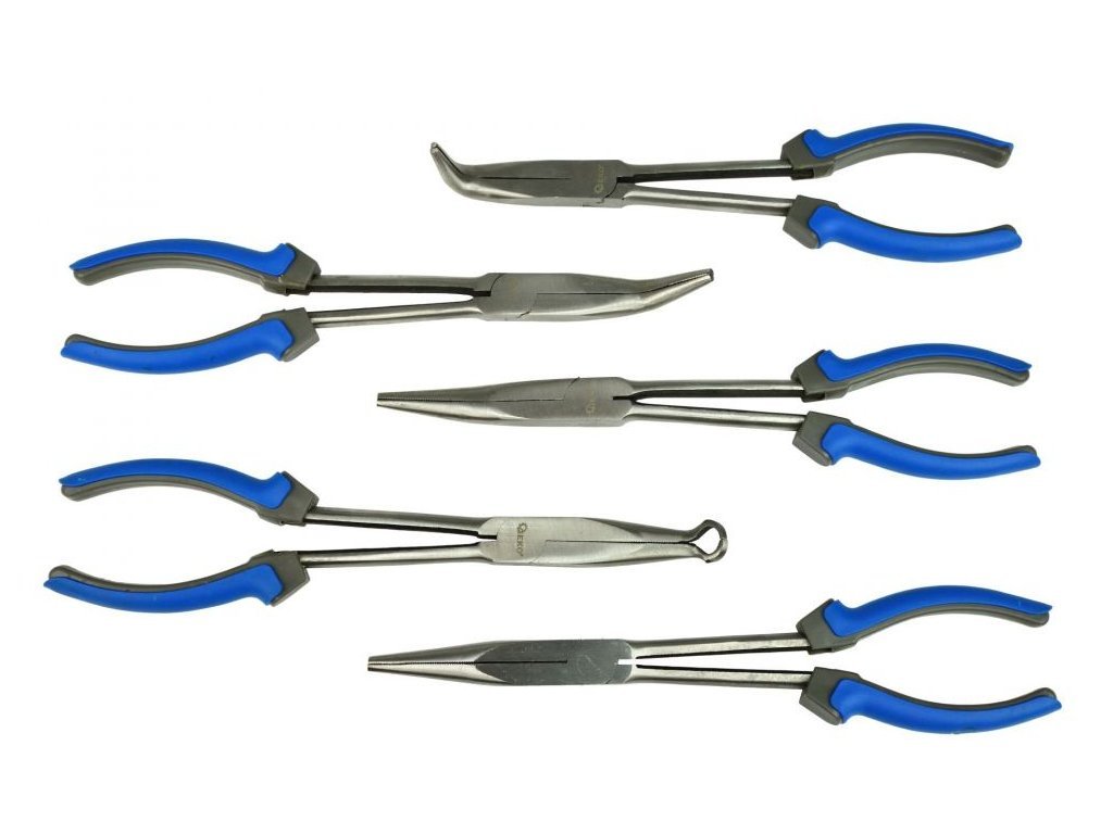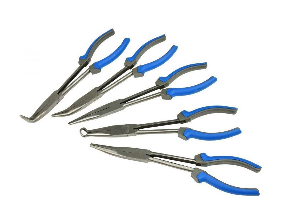 Sada pěti kusů dlouhých kleští, rovných, zahnutých a kulatých pro různorodé využití. Vyrobeno z CrV oceli, rukojeť je vyrobena z odolného plastu, navíc potažena vrstvou protiskluzové pryže zajišťující pevný a pohodlný úchop.