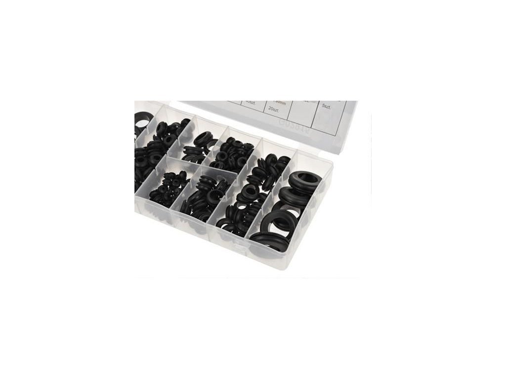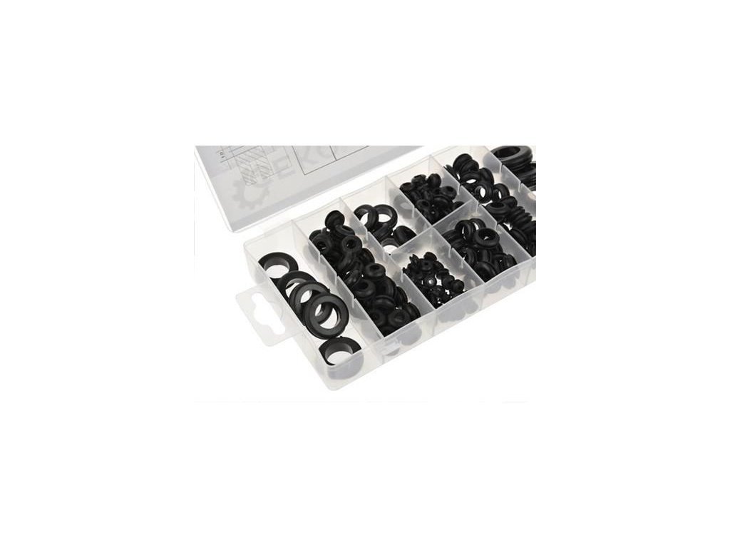 Sada 180 gumových průchodek. Průchodky zabraňují poškození nebo prořezání kabelu o hranu. Sada obsahuje průchodky odpovídající otvorům s průměry: 6, 7,3, 8,7, 10,5, 12, 14,8, 21 a 24 mm.