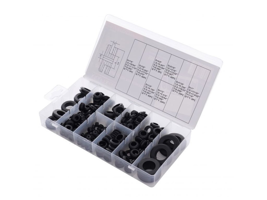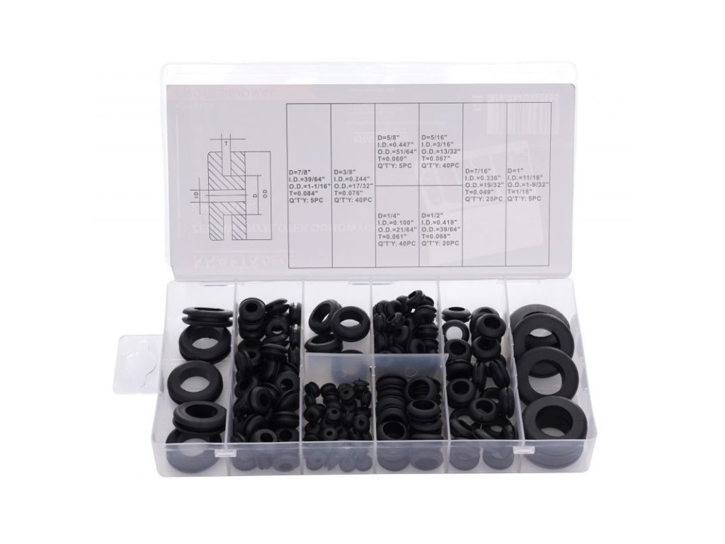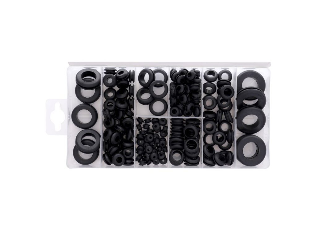 Sada 180 gumových průchodek. Průchodky zabraňují poškození nebo prořezání kabelu o hranu. Jsou velmi užitečné pro zmenšení průměru otvorů. Průchodky lze také použít k dokončení ostrých hran otvorů. Sada se bude hodit všude tam, kde je problém s tím, jak zakončit otvor, aby nepoškodil dráty.