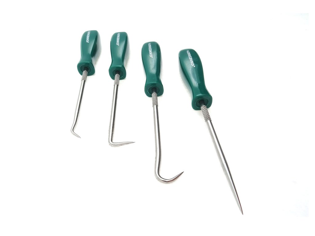 Souprava ocelových háčků (3 ks) s různě zahnutými hroty a jedné „jehly“ využitelná k odstraňování gufer, O-kroužků, těsnění, k čištění, propichovaní, napínání pružinek (např. při servisu bubnových brzd) apod.