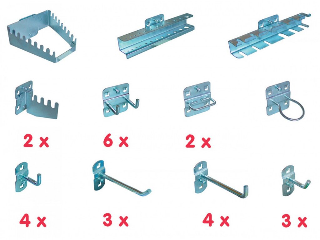 Sada obsahuje 28 ks háků a držáků - závěsné háky šikmé/pravoúhlé (14), dvojité závěsné háky (6), závěsné držáky na vrtáky/šroubováky/montážní klíče/pily/kleště (1).