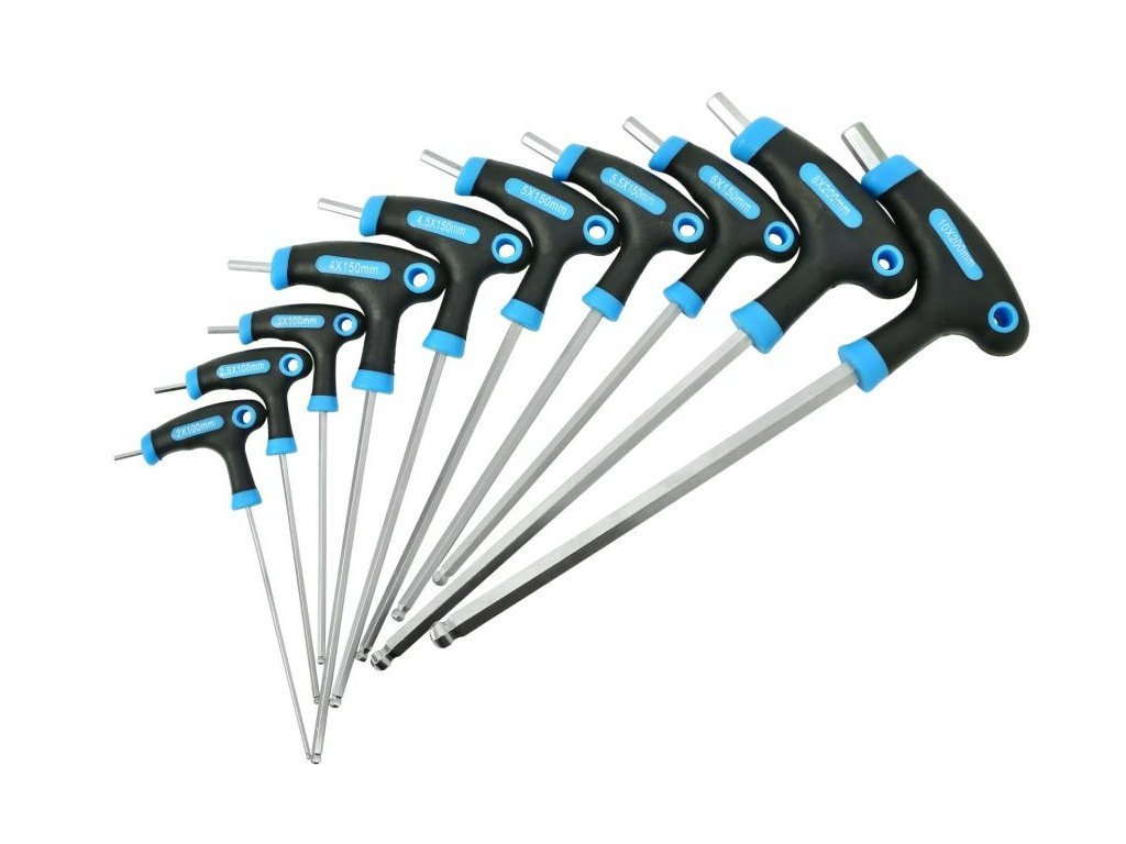 Sada imbusových klíčů typu T. Vyrobeno z nástrojové CrV oceli. Mají pohodlnou a ergonomickou rukojeť. Sada obsahuje 10 klíčů o velikostech od 2 mm do 10 mm a stojan, který lze zavěsit na zeď.