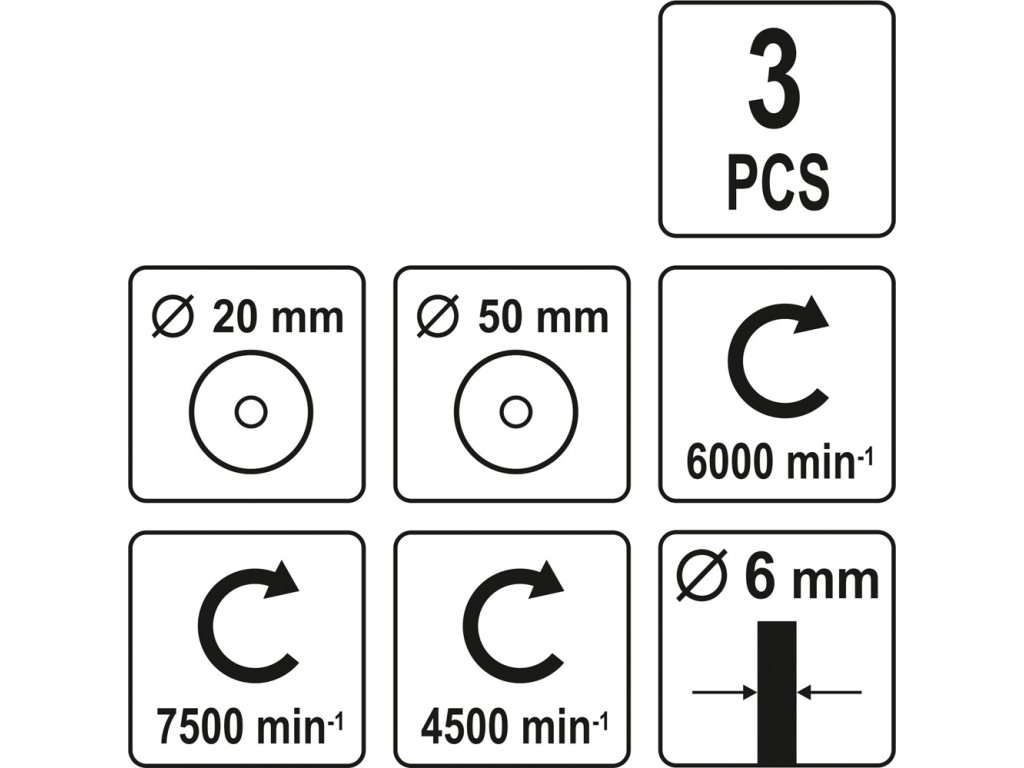 Kotouče mají průměry 20, 50 a 50 mm, jsou vhodné pro použití do 4500/6000/7500 ot/min a jsou opatřeny upínácí stopkou průměru 6 mm.