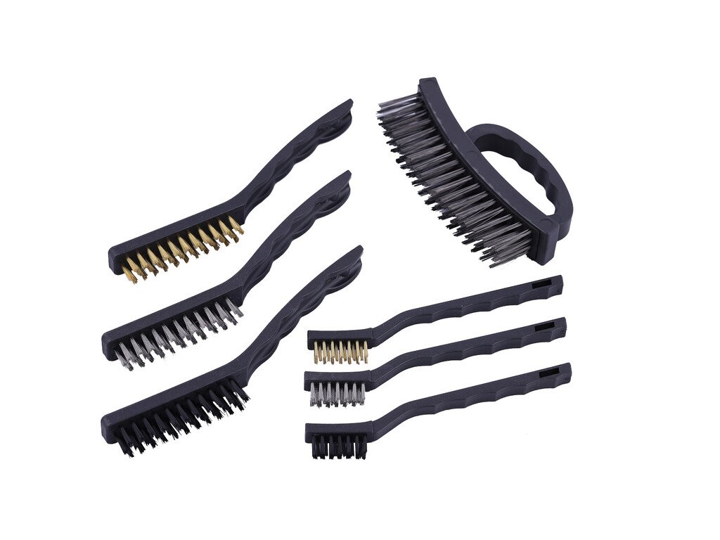 Univerzální sestava různé velkých kartáčů a kartáčků pro autoservis, dílnu, průmysl i domácnost. Zatímco nářadí s kovovými štětinami je vhodné pro hrubé očišťování např. od rzi a dalších odolných nečistot, nylonová varianta je určená pro jemnější práci (např. citlivější povrchy apod.).