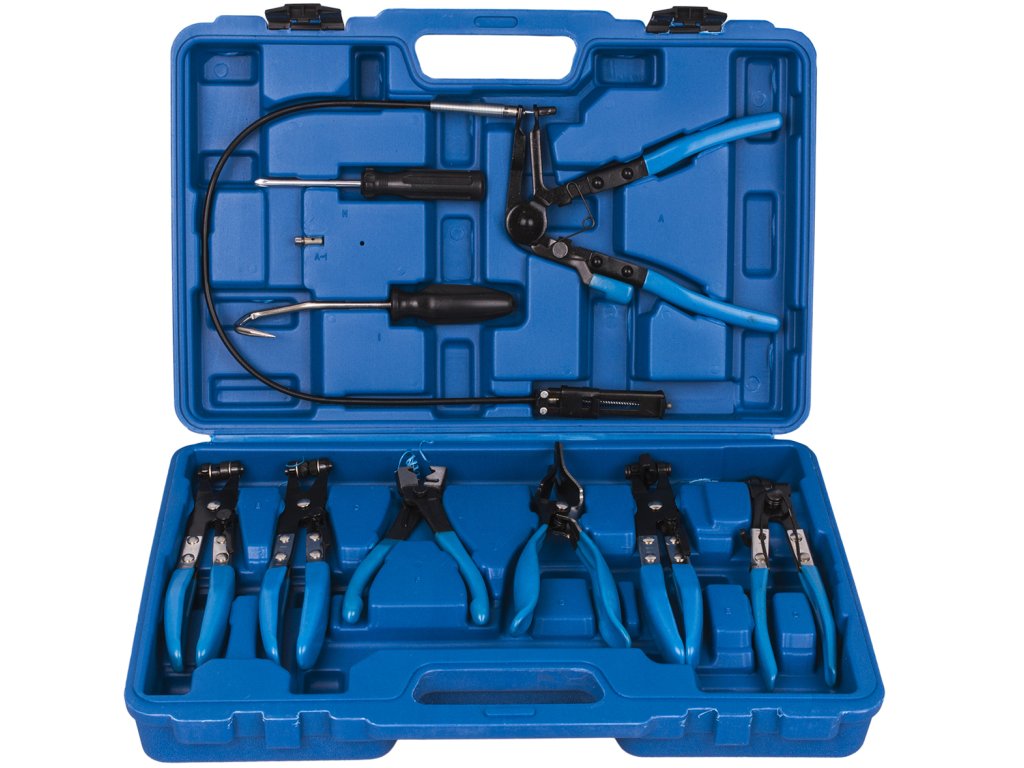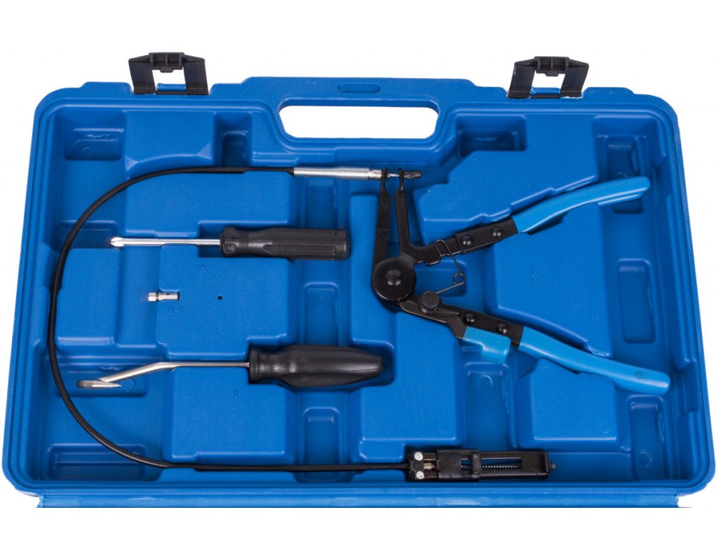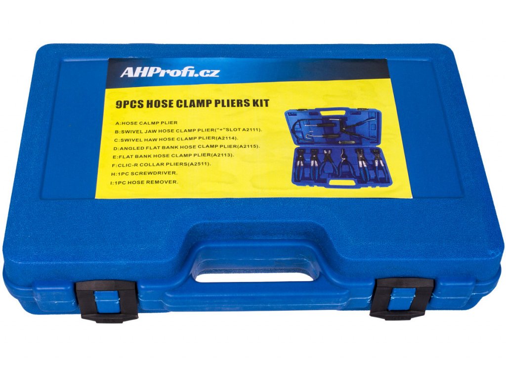 Sada v plastovém kufříku obsahuje 7 ks kleští na hadicové spony, přípravek na demontáž hadic a šroubovák na hadicové spony.
