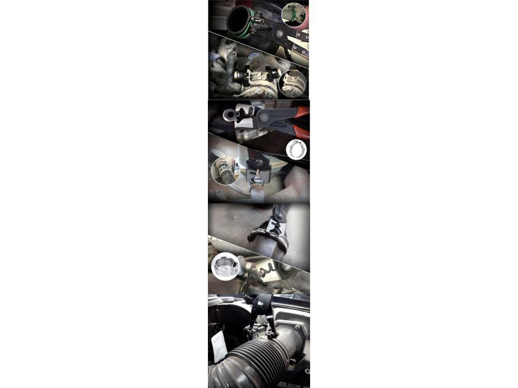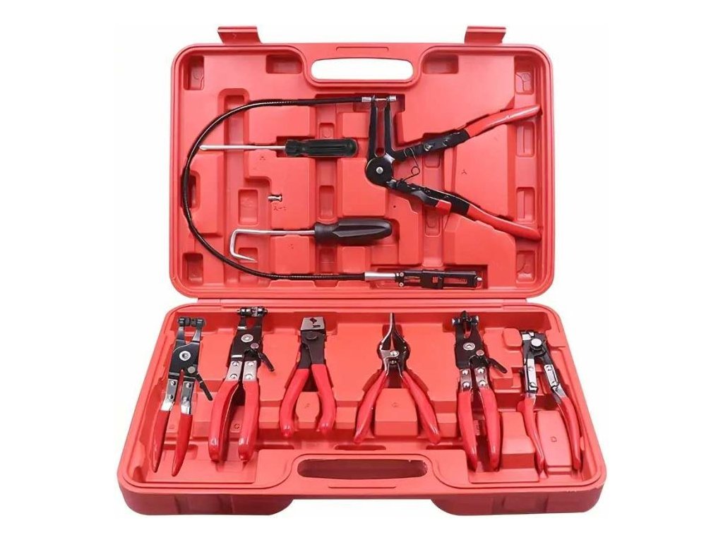 Sada kleští na hadicové spony Sada 9 kleští pro většinu hadicových spon používaných v automobilovém průmyslu, včetně speciálních s lankem pro nepřístupná místa.**Obsah sady:**