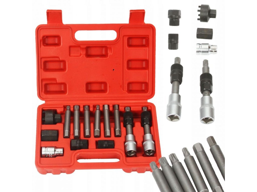 Sada klíčů pro montáž a demontáž alternátorů. Bity jsou vyrobeny z CrV chrom-vanadiové oceli. Klíče umožňují současné vyšroubování upevňovacího šroubu řemenice (pomocí vhodného bitu) a přidržení řemenice se spojkou pomocí speciálního násadky.