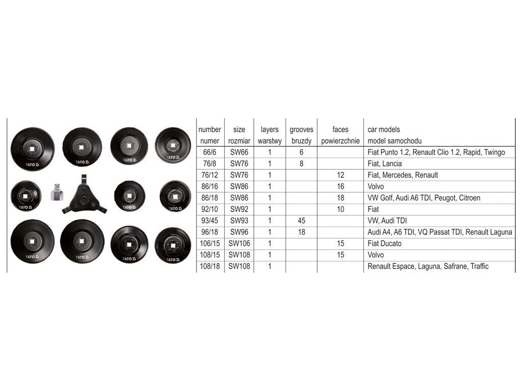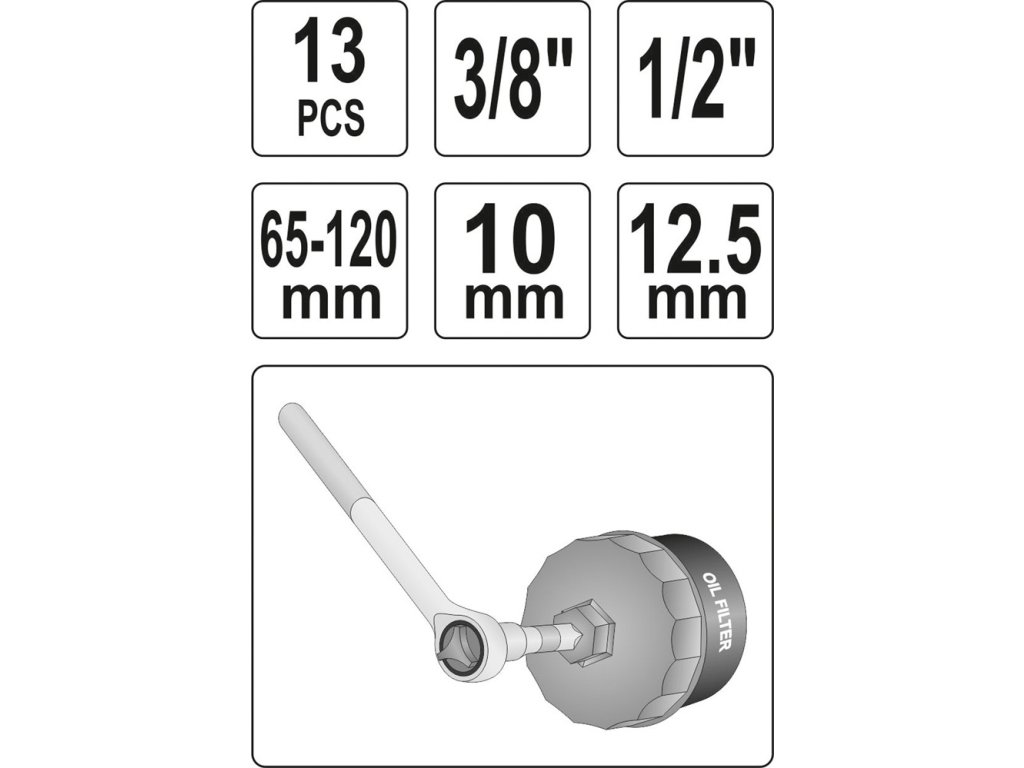 Jednotlivé misky mají zakončení velikosti 3/8". Souprava obsahuje 11 miskových klíčů, nastavitelný klíč s rozsahem 63 - 102 mm a redukci 3/8" - 1/2“.