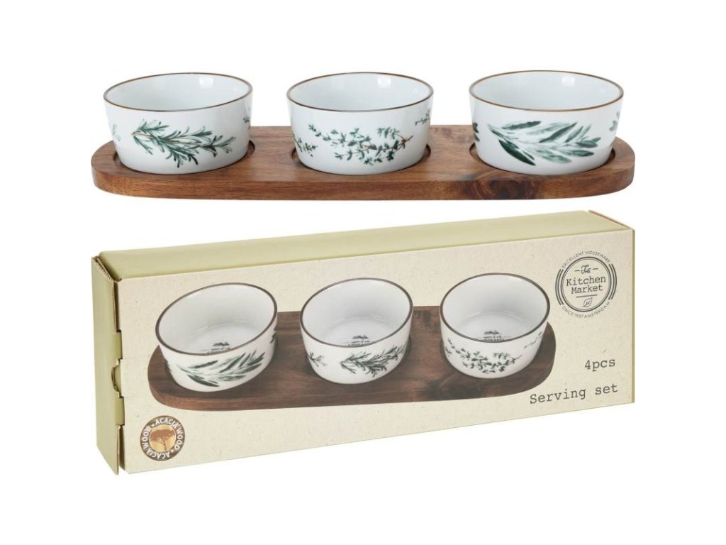SERVING SET OF 4PCS, 3X STONEWARE BOWLS, SIZE: DIA 85XH40MM, WEIGHT: 142 GRAM. ON ACACIA (ACACIA CONFUSA) TRAY, SIZE: 300X100XH12MM, WEIGHT: 160 GRAM, BOWLS IN WHITE REACTIVE GLAZE COLOR WITH HERBS DESIGN, WITH 3 DIFFERENT DESIGNS IN EACH SET, IN OUR DESIGN COLORBOX/ 300X60X105MM, Color box (CLB-C): 1 X Tray, Acacia, 300X100X12MM,3 X Bowl, Porcelain, 85X85X40MM / CFT 0,97,(34.900/40ft HQ)Doplňkové parametry